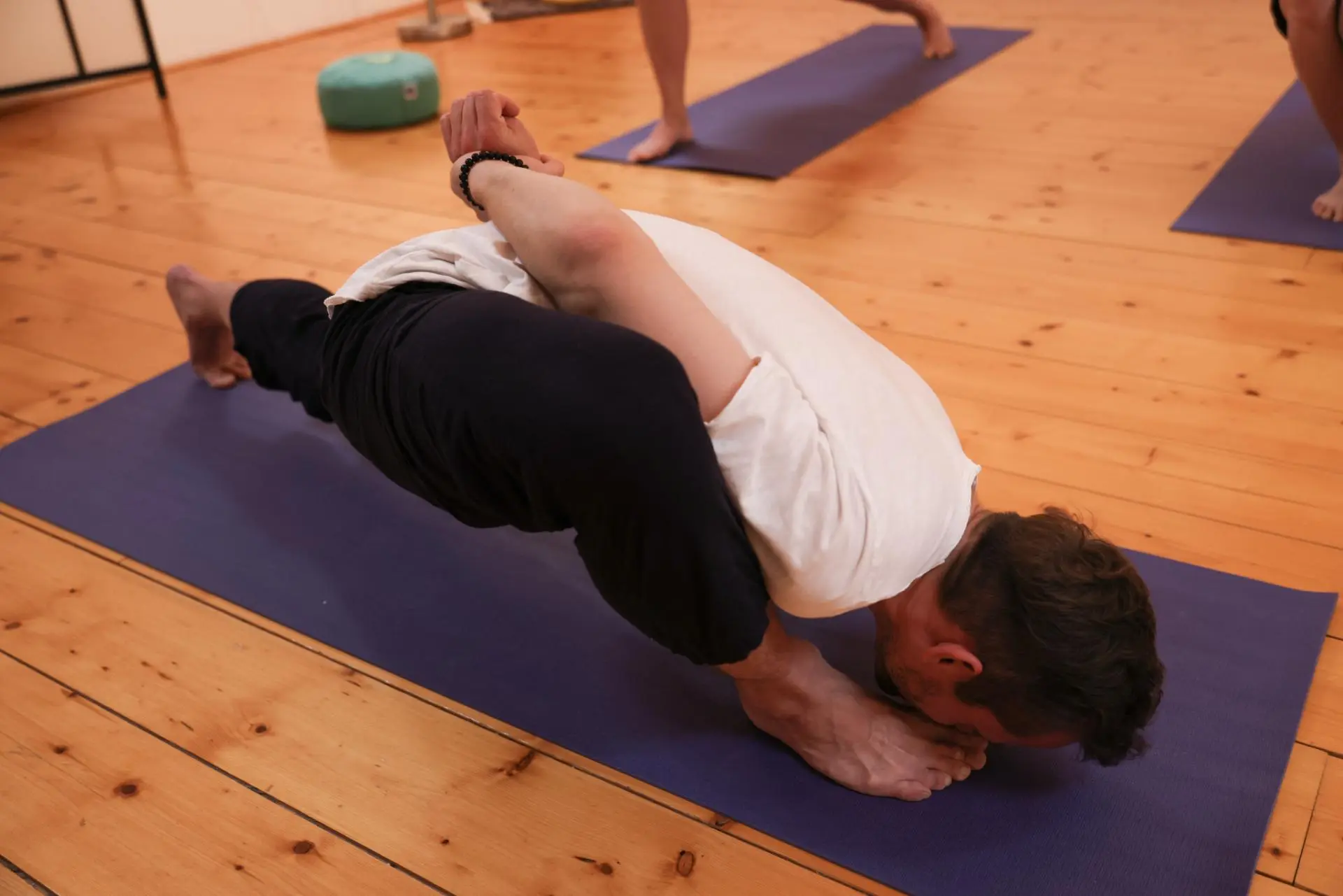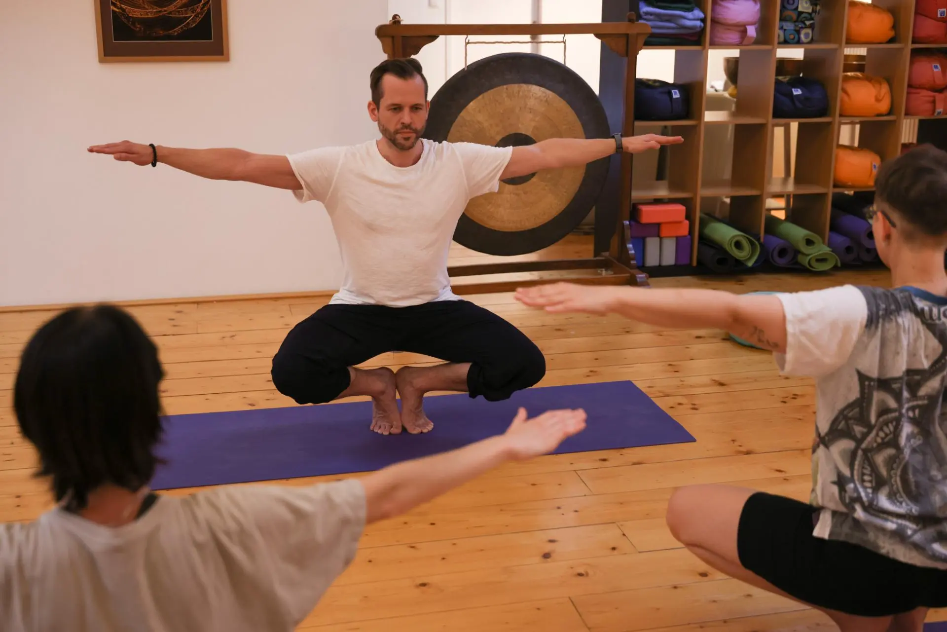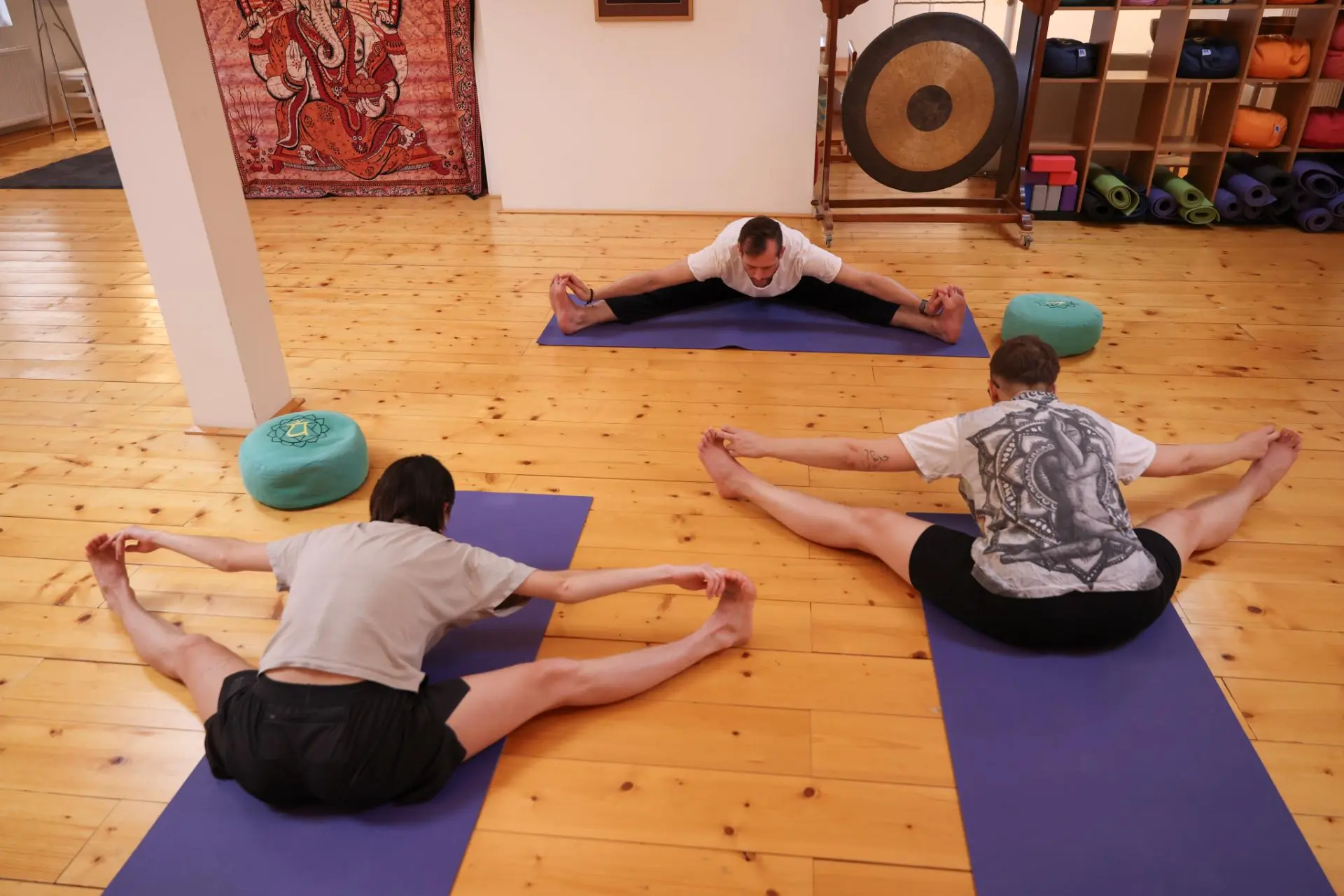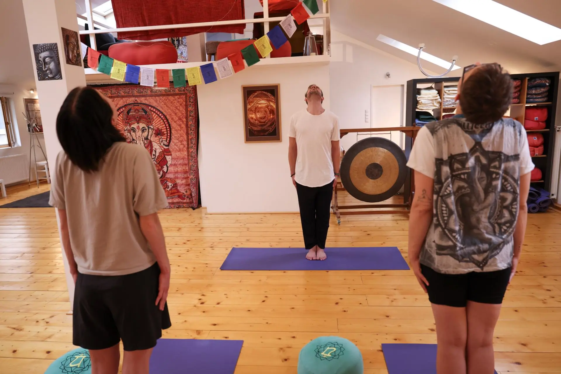 Wir starten die Einheit gewöhnlich mit Atmung, gefolgt von Asanas (Bewegung) und einer abschließenden Meditation.